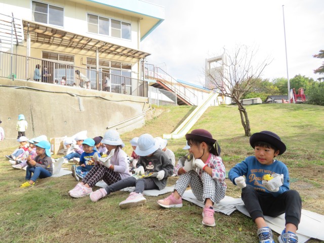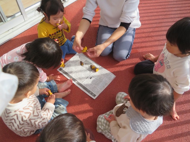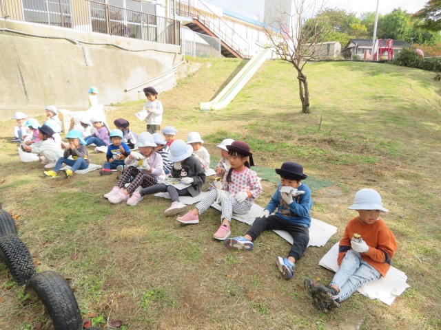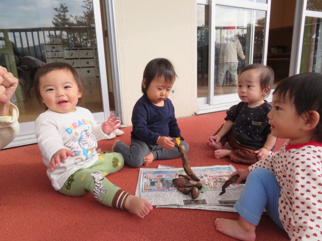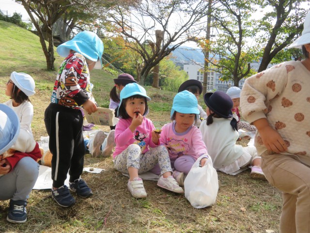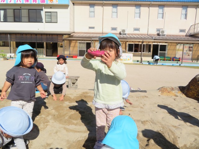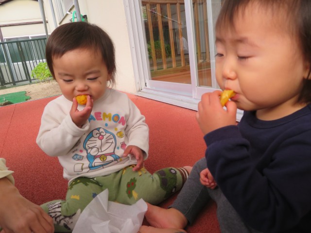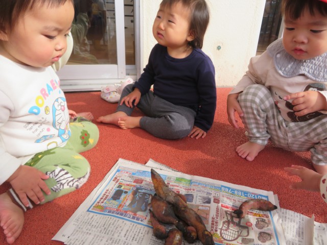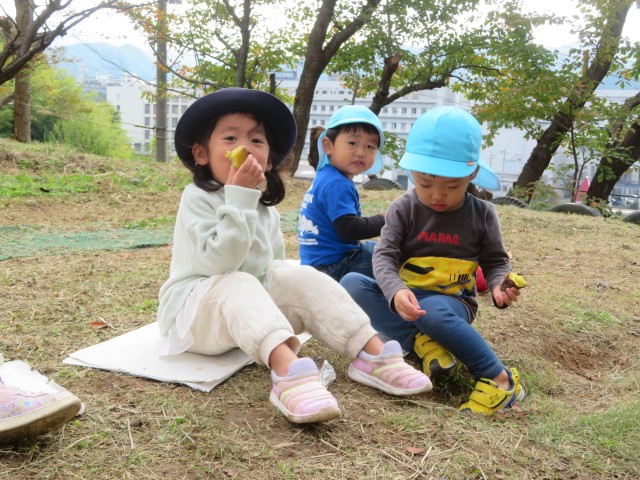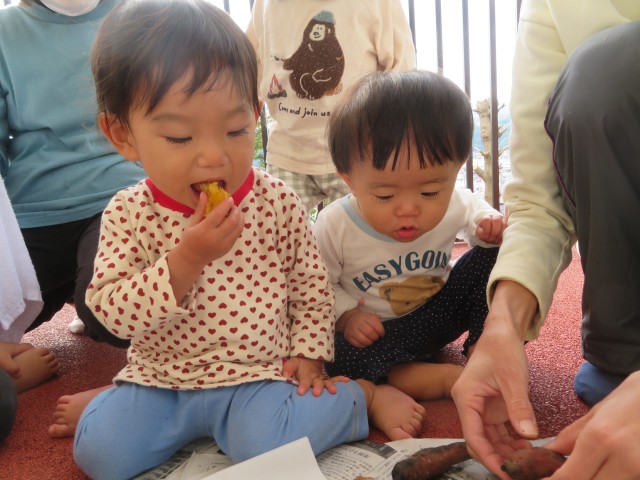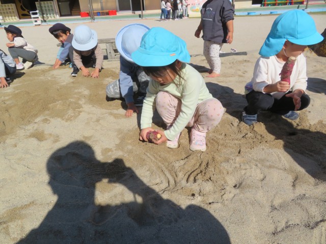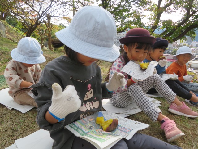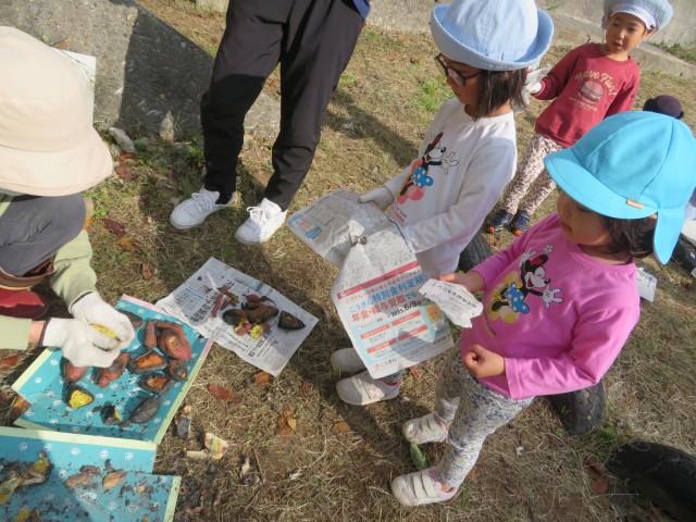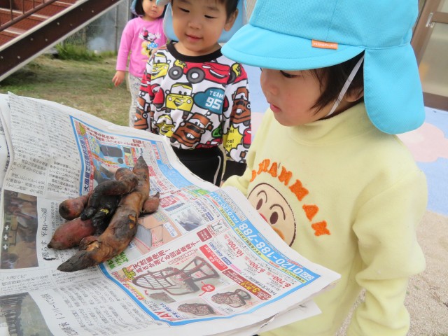 1時間くらいで、良い匂いがしてきました。焼き上がった、いもは早速、園庭でみんなで、食べました。早速、みんなで熱々を食べました。