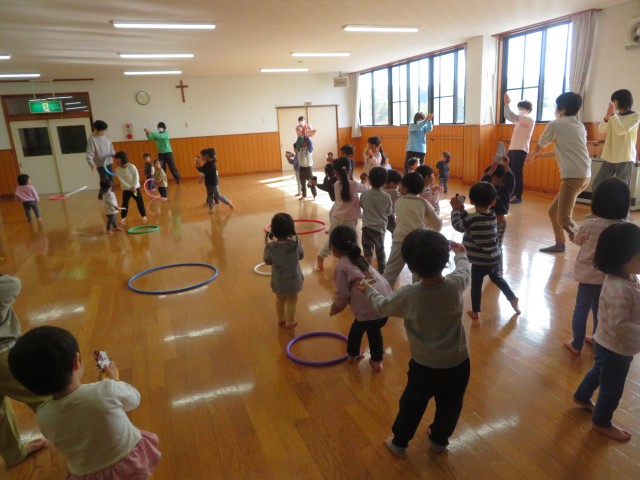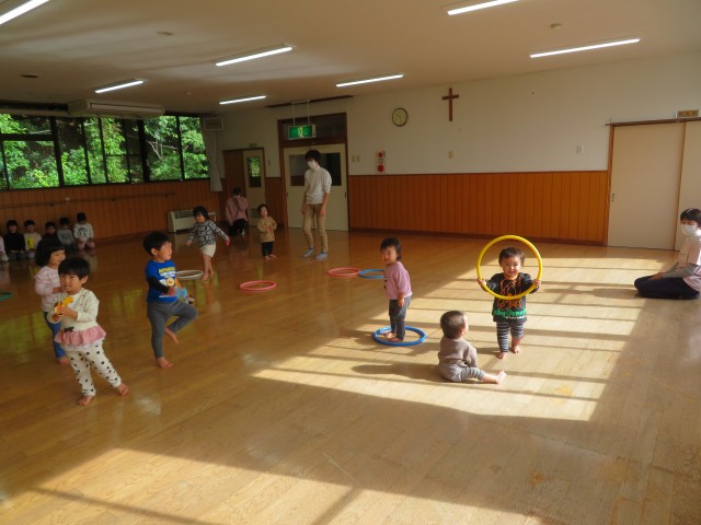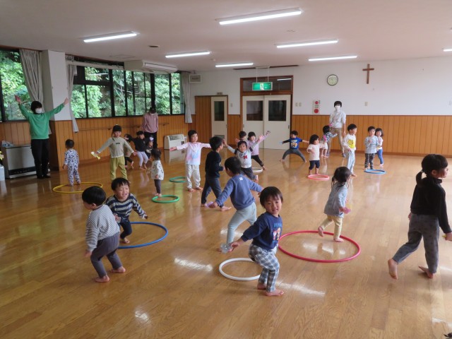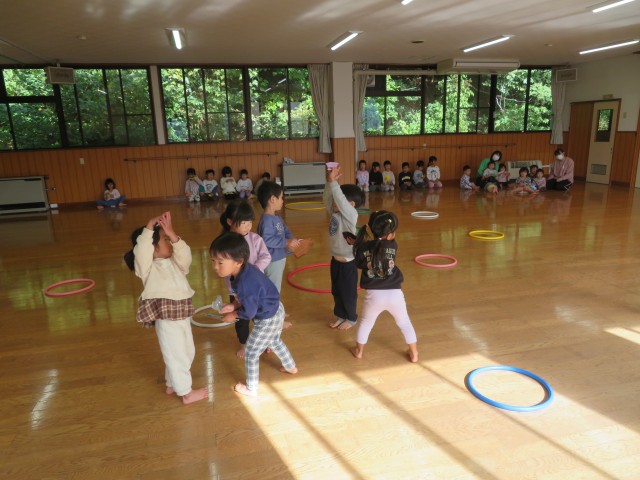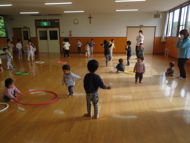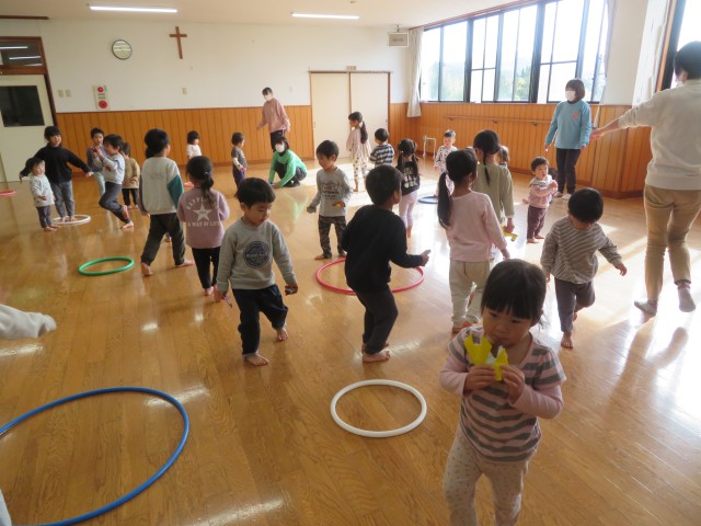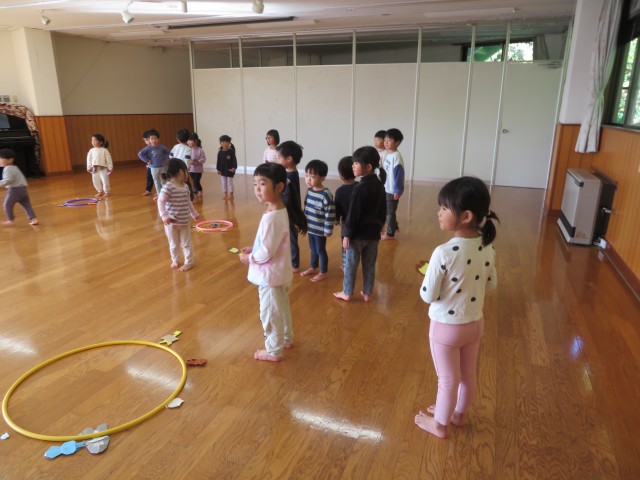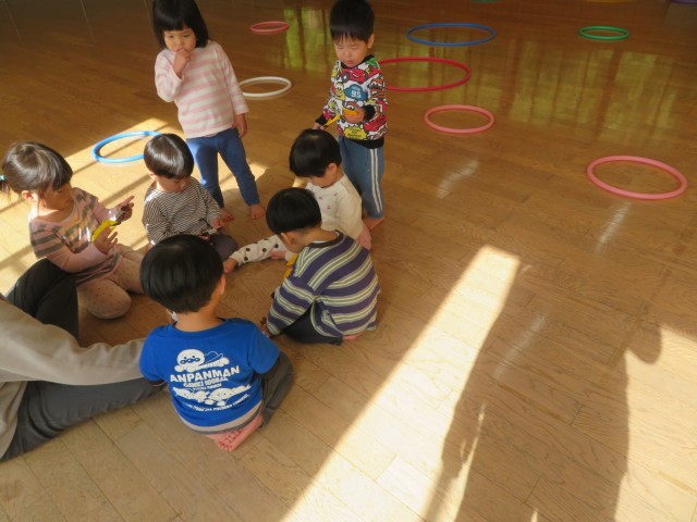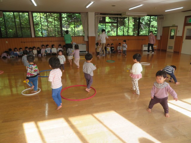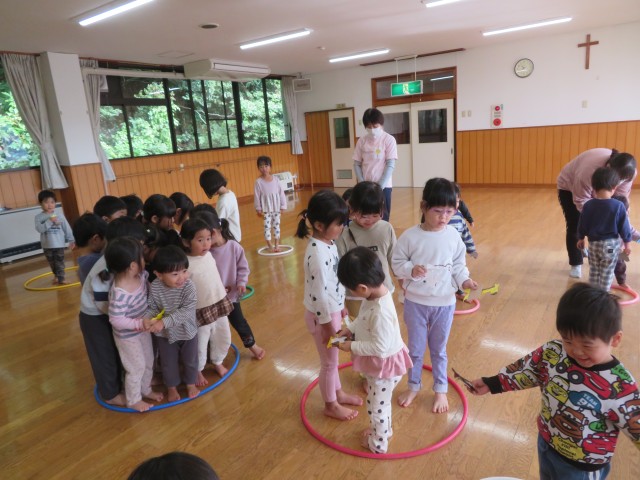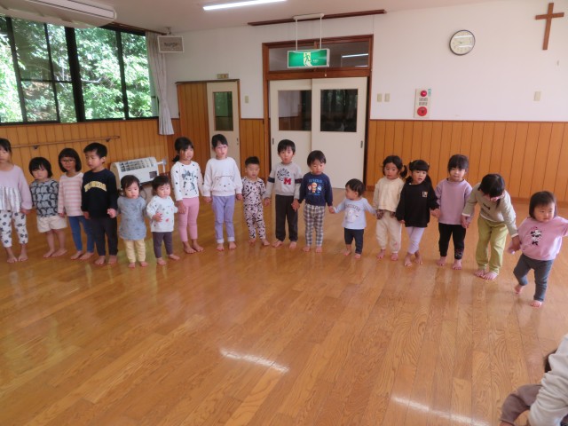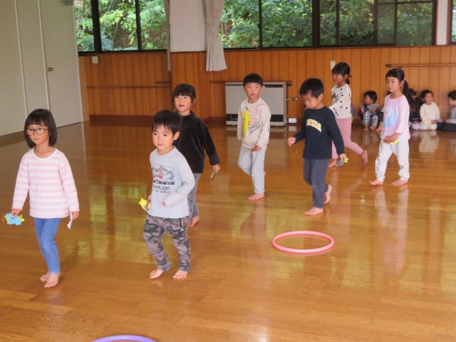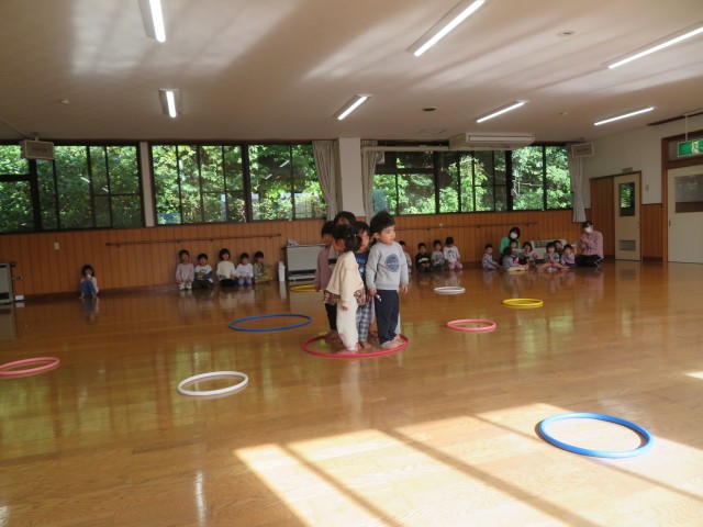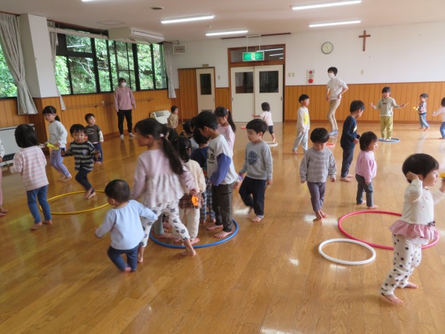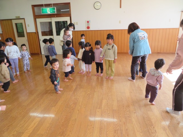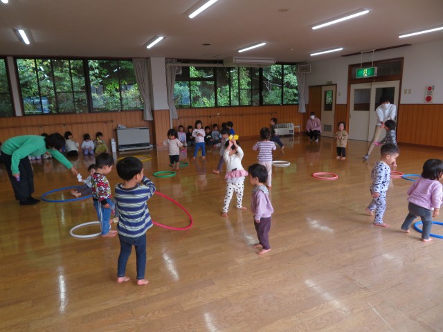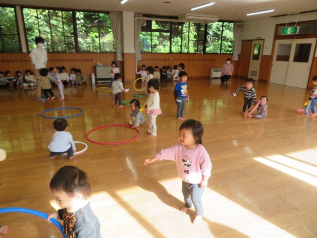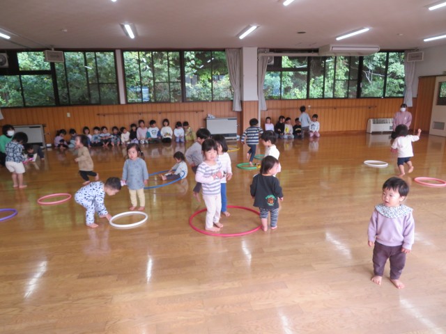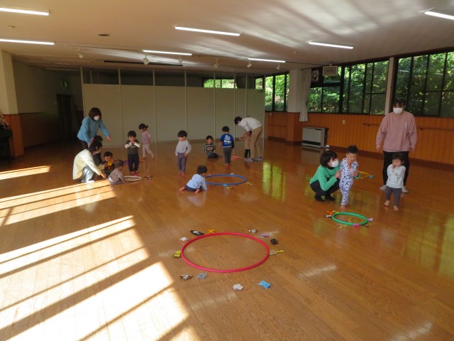 ホールに集まって「みんなでみーつけた!」をテーマに折り紙でできた自分たちのクラスの動物を探して楽しみました。