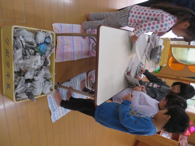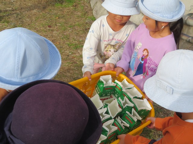 ひかり組さんが濡れた新聞紙で包んで、アルミホイルでくるんで、牛乳パックに詰めました。そして牛乳パックごと焚火にいもを投入。みんなで焼き上がるのを待ちました。