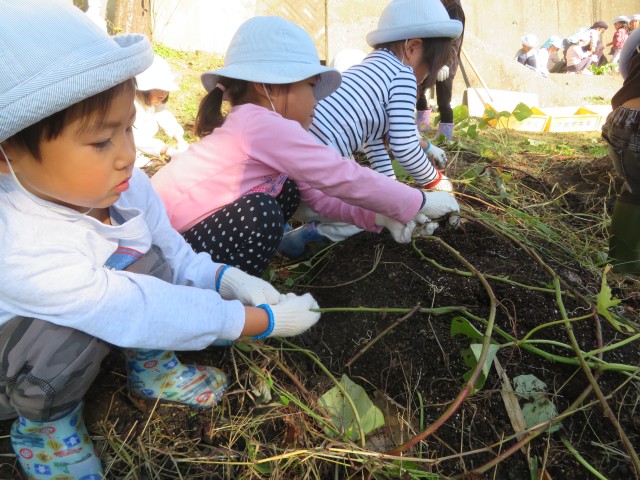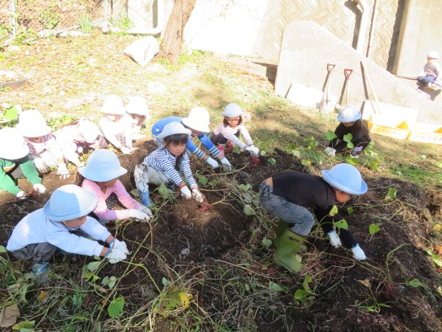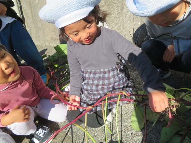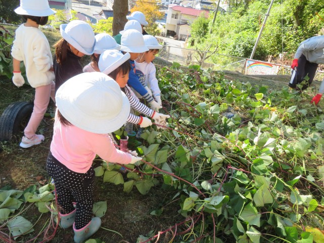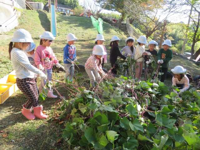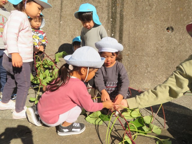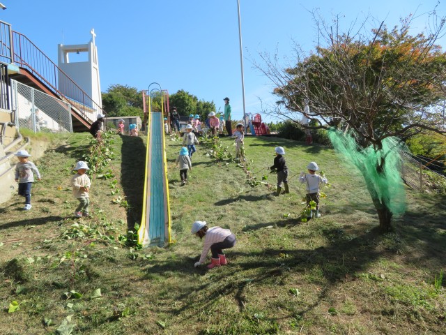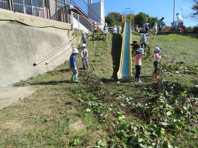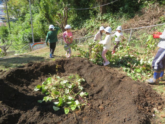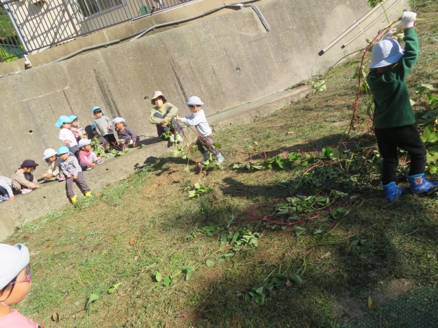 保育園の第2グランドの畑に6月6日にひかり組さん・めぐみ組さんが植えたさつまいも(紅あずま)を収穫しました。