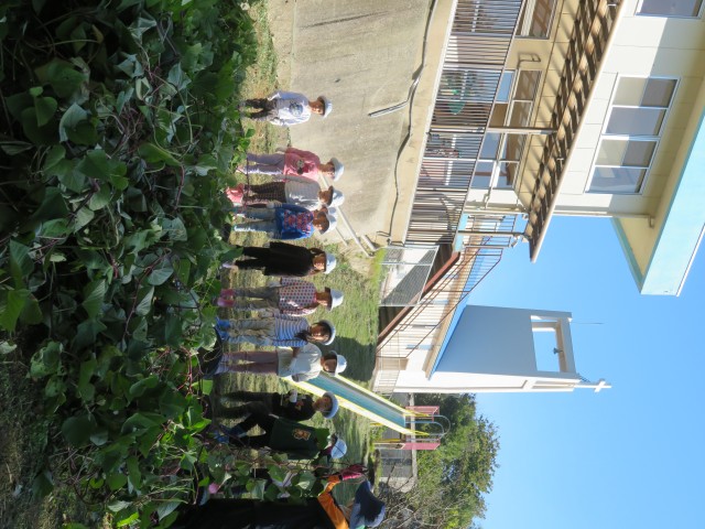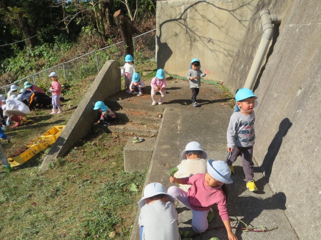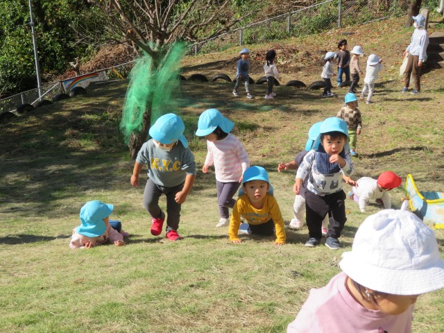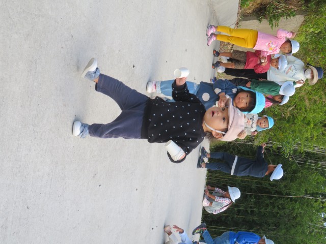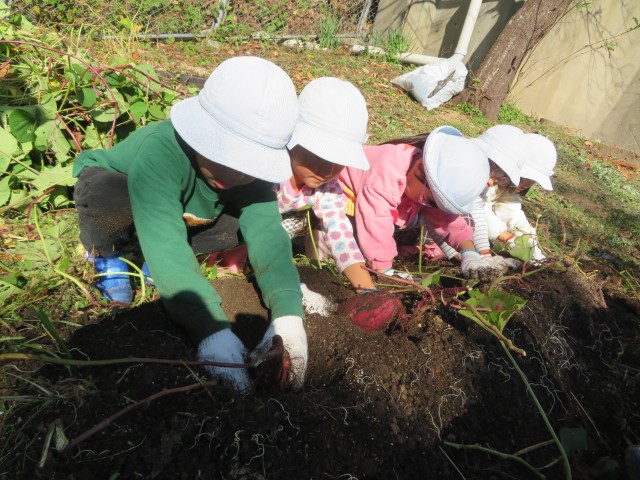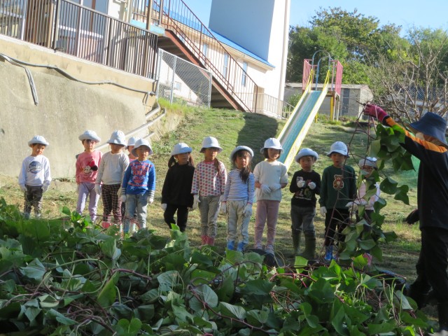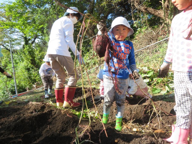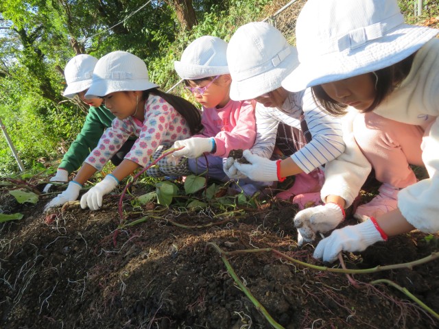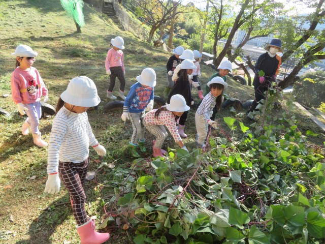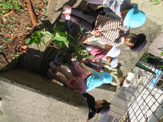 保育園の第2グランドの畑に6月6日にひかり組さん・めぐみ組さんが植えたさつまいも(紅あずま)を収穫しました。