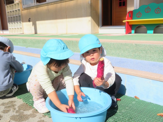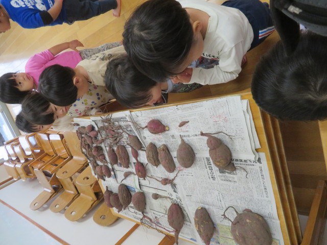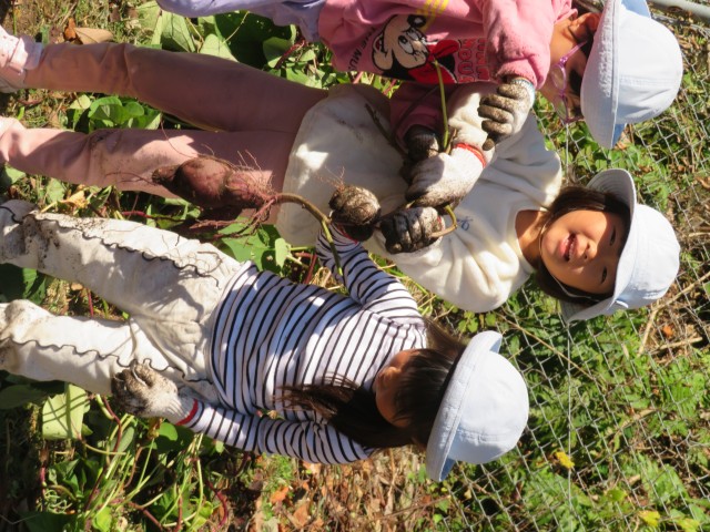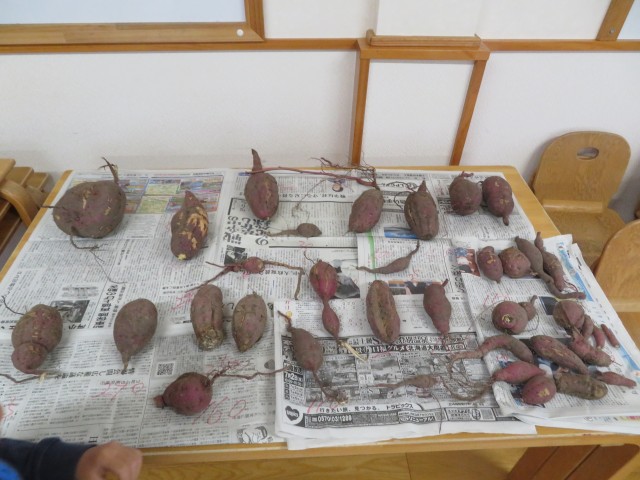 ひかり組さんが中心になって、保育園の畑で6月に植えて、育ててて、10月30日に収穫したさつまいも(紅あずま)。保育園の畑で焼きいもにしてみんなで食べました。