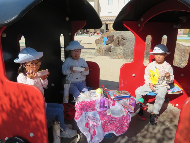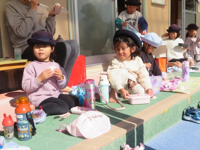 お昼はお弁当バイキング!!はな、めぐみ、ひかり組さんは気持ちが良い空の下、園庭やテラスで食べました(^▽^)/