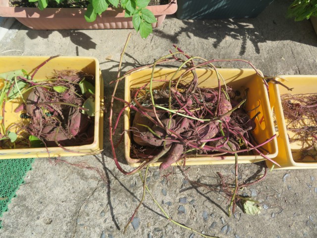 今年の猛暑でも枯れることなく、大小、いろいろな形のいもを収穫することができました。